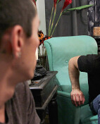 Kain Lanning and Ryan Sharp kiss in the kitchen before Kain sits down to let Ryan suck his dick. The lip-pierced stunner works over the vampire's dick before getting his own cock wet. These two make use of the island in the kitchen by fucking all over it. First Kain takes Ryan like a dog before getting him flat on his back. Ryan cums while he's being fucked just before Kain squirts all over his chest.